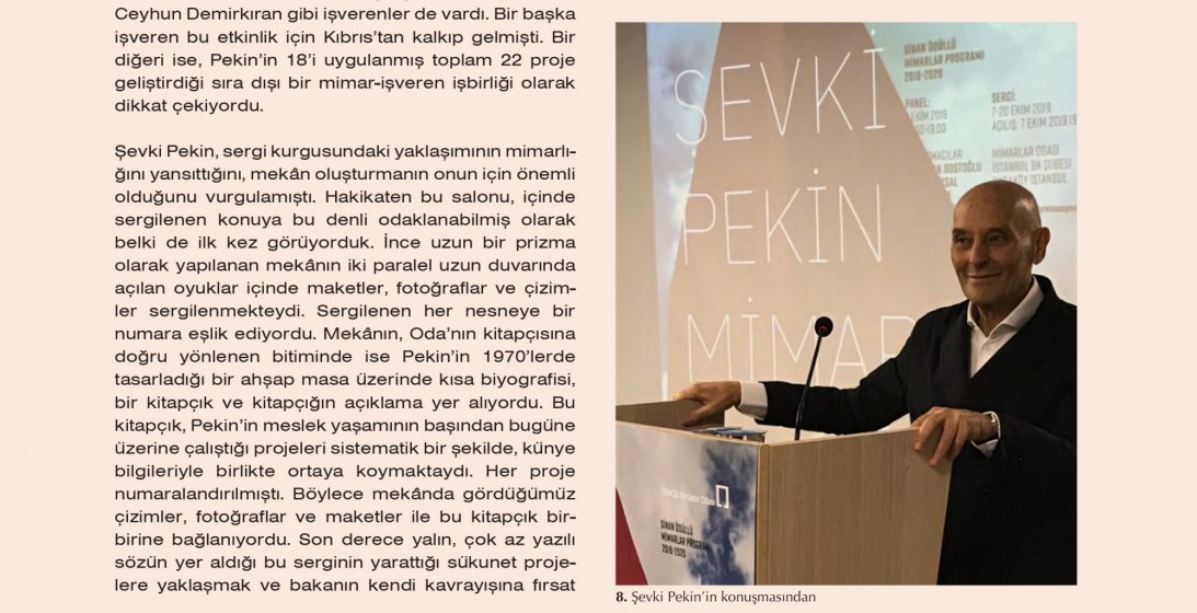 | Mimarlık 410, Kasım-Aralık 2019 | Pelin Derviş, “Zamanlar ve Mekanlar Arasında Bir Mimarlık Anlayışıyla Şevki Pekin”, s. 2, 22-25. |